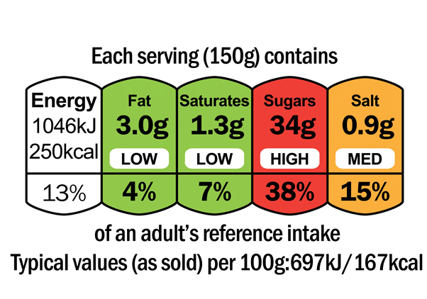 - Ενέργεια: Η ενέργεια είναι η πρώτη τιμή στην διατροφική ετικέτα. Εκφράζεται σε κιλοτζάουλ (kj) και χιλιοθερμίδες (kcal) οι χιλιοθερμίδες αναφέρονται ως θερμίδες). Κάποια τρόφιμα είναι υψηλά σε περιεκτικότητα ζάχαρης και λίπους, είναι δηλαδή ενεργειακά πυκνά, που σημαίνει ότι περιέχουν περισσότερες θερμίδες, βάρος προς βάρος (w/w), από άλλα τρόφιμα. Αναλυτικότερα, τα ενεργειακά πυκνά φαγητά περιέχουν περισσότερο από 225-275 kcal ανά 100g.