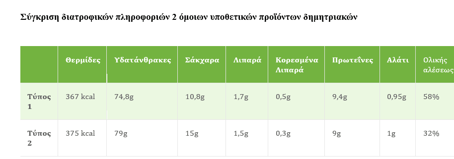 Στον παραπάνω πίνακα παρατηρούμε ότι θερμιδικά τα δύο προϊόντα δημητριακών φαίνονται ίδια, ωστόσο,